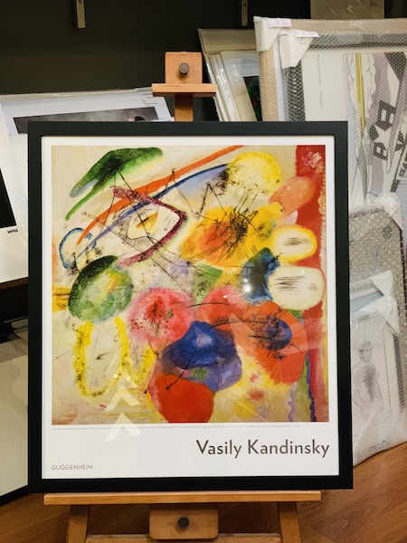 A Kandinsky poster from the Guggenheim museum framed in a black timber frame with glass.