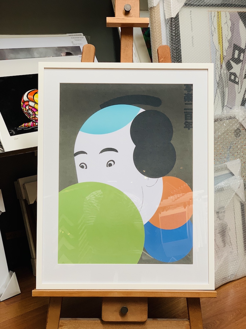 A Japanese print framed in a white timber frame with glass.