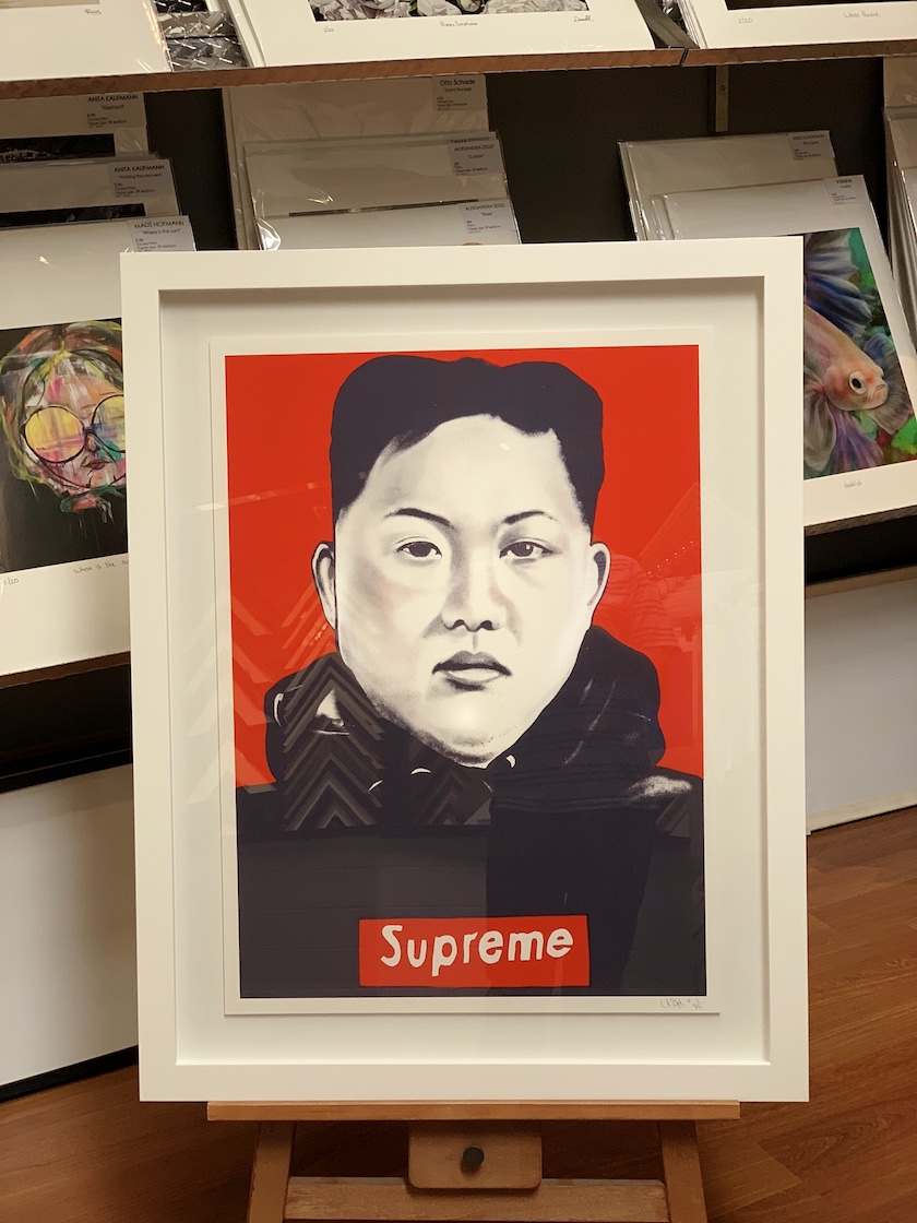 A Kim Jong-un poster framed in a white timber frame, floated on a white mat board with a spacer and UV glass.
