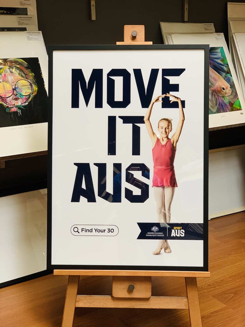 A ballet Sport Aus promotional print part of the Move It Aus campaign framed in a black box frame with glass.