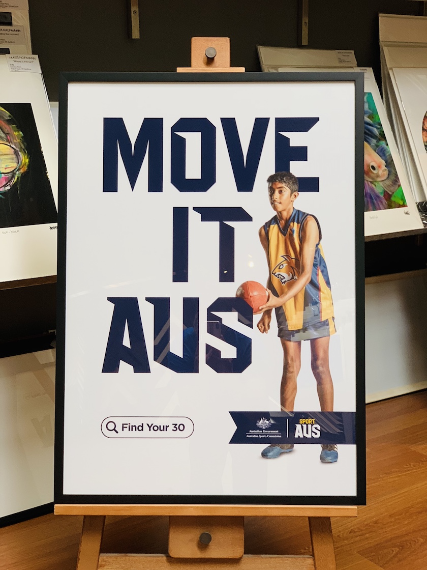 An AFL Sport Aus promotional print part of the Move It Aus campaign framed in a black box frame with glass.