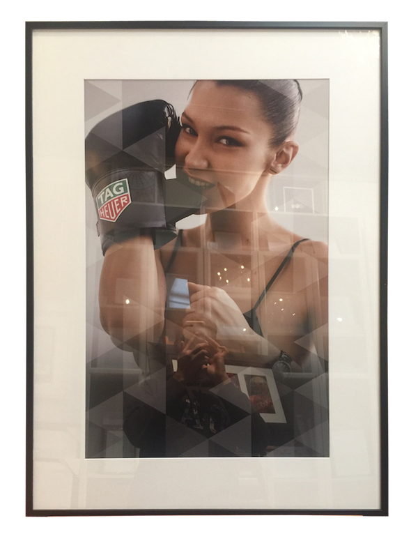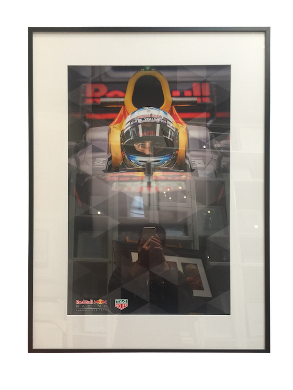 A promotional photo for TagHeuer framed in a narrow box frame with mat board surround and plexiglas.