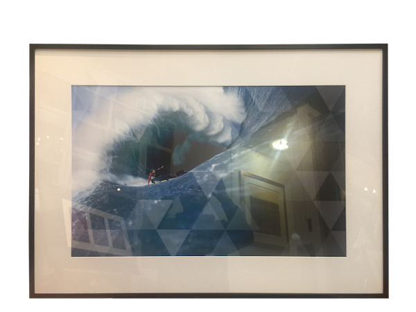 A promotional surfing photo framed for TagHeuer in a narrow box frame with a mat board surround and plexiglas.