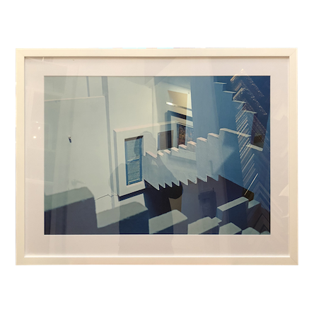 A contemporary photo framed in a white box frame with an acrylic front and mat board surround.